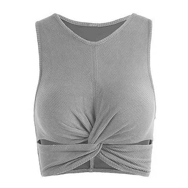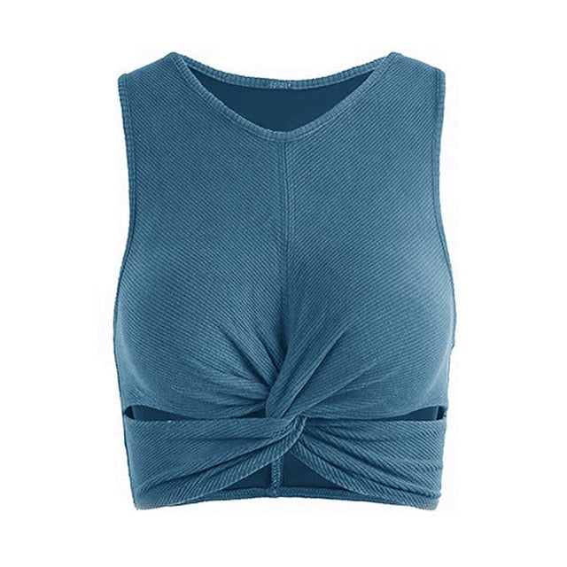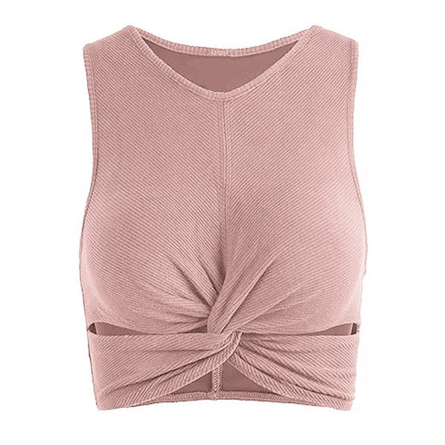 Material: Spandex,Polyester Gender: Women Sleeve Length(cm): Sleeveless Feature: Quick Dry,Breathable Fabric Type: Knitted Model Number: Knotted Ribbed Vest Sports Bra Fit: Fits true to size, take your normal size Item Type: Shirts Sport Type: Yoga